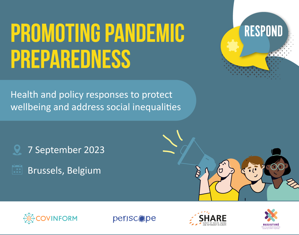 This conference is organised by the RESPOND project, in collaboration with the COVINFORM, PERISCOPE, RESISTIRÉ, and SHARE-COVID projects. These projects were funded by a SARS-CoV-2 grant from the European Union, within the scheme “Innovative and rapid health-related approaches to respond to COVID-19 and to deliver quick results for society for a higher level of preparedness of health systems (SC1-PHE- CORONAVIRUS-2020-2)”.