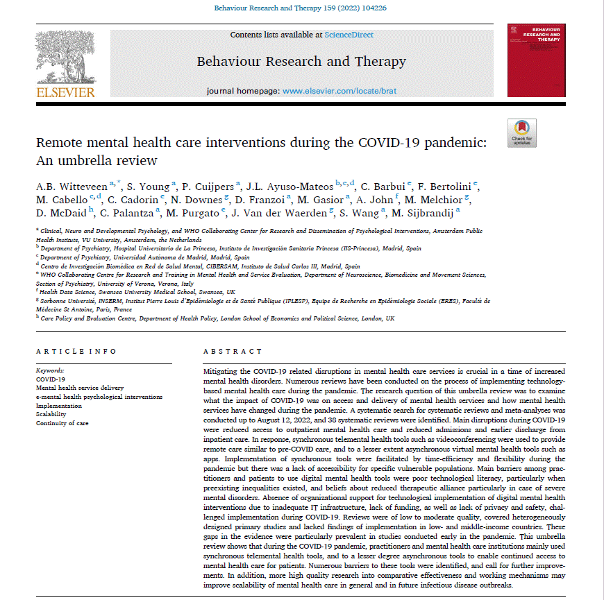 Witteveen, A. B., Young, S., Cuijpers, P., Ayuso-Mateos, J. L., Barbui, C., Bertolini, F., Cabello, M., Cadorin, C., Downes, N., Franzoi, D., Gasior, M., John, A., Melchior, M., McDaid, D., Palantza, C., Purgato, M., Van der Waerden, J., Wang, S., Sijbrandij, M. (2022). Remote mental health care interventions during the COVID-19 pandemic: An umbrella review. Behaviour Research and Therapy, Volume 159, 2022, 104226, ISSN 0005-7967, https://doi.org/10.1016/j.brat.2022.104226.