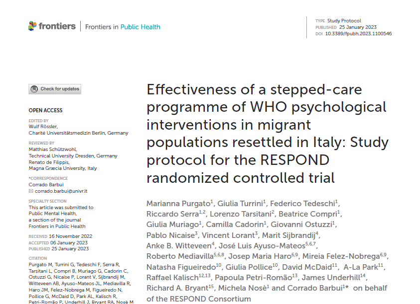 RESPOND researchers at the University of Verona, in collaboration with the RESPOND consortium, have recently published the study protocol for the randomised controlled trial they are conducting among migrants (including refugees) that have re-settled in Italy. The article was published in Frontiers in Public Health.